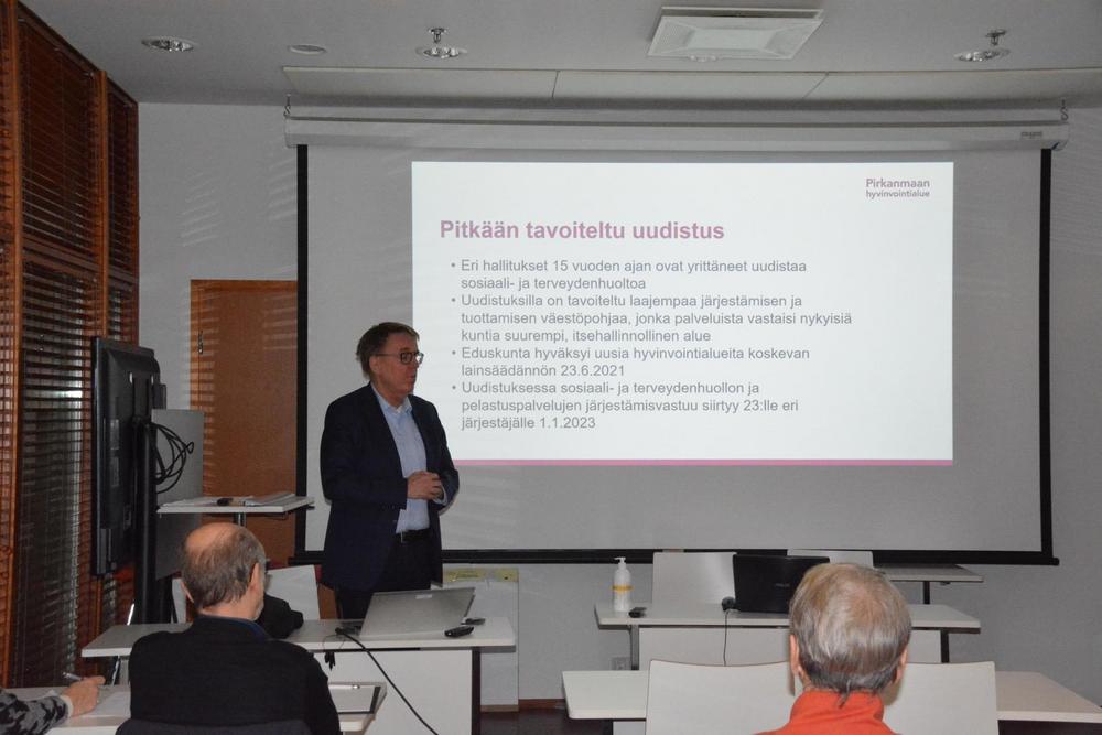 Alustajina toimivat muutosjohtaja Jukka Alasentie pirkanmaan hyvinvointialueelta ja varapuheenjohtaja Juha Salonen Tampereen vanhusneuvostosta. Lopuksi PYNK:n jäsen Antero Saksala valotti ikäihmisten edunvalvonnan merkitystä ja organisointia hyvinvointialueella.